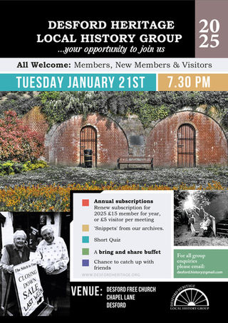 Local History Group talks are held at Desford Free Church, Chapel Lane, LE9 9GE every other calendar month. You can become a member for an annual fee of £15 or as a visitor pay £5 per meeting. For more information or to be added to our mailing list email the local History Group at info.desfordhistory@gmail.com
